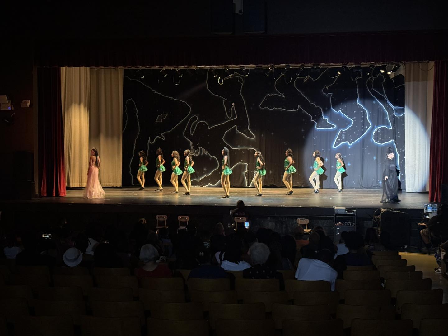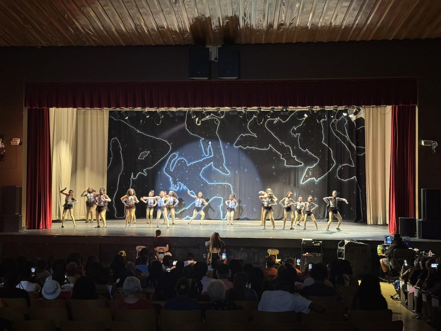 C – Backdrop has been rented several times and has mild cracking of the paint. Will have repairs and stains visible from closer distances and under certain lighting. Usable for most venues and can be improved with proper lighting. Best used on stage and some distance from the audience.