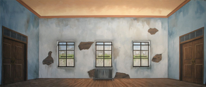 C – Backdrop has been rented several times and has mild cracking of the paint. Will have repairs and stains visible from closer distances and under certain lighting. Usable for most venues and can be improved with proper lighting. Best used on stage and some distance from the audience.