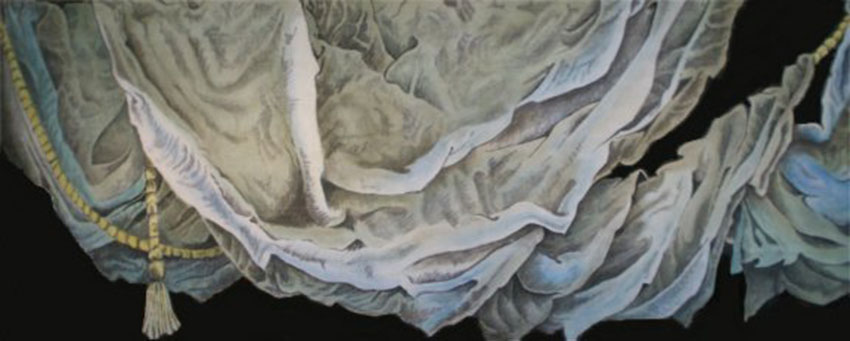 Painted Swag Drape by Grosh Backdrops displays an elegant white drape with a swag and a gold tassle.  This theatrical backdrop rental is ideal for dance performance that need the graceful touch to offset their dancers.  It is also ideal for bands playing soft jazz or a wonderful mozart performance.