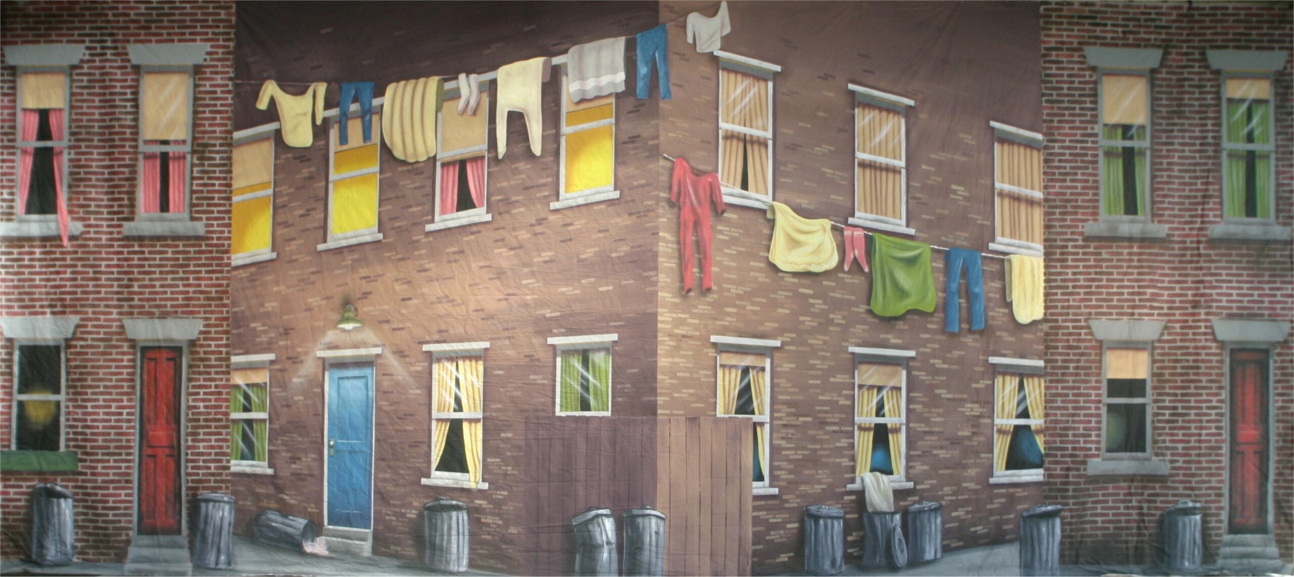 B – In newer condition with minor wear which may include repairs and cracking in some of the painted areas. May show fading in darker areas of drop. Backdrop is usable for all venues.